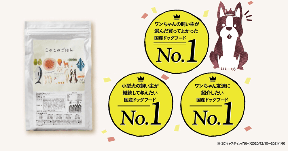 このこのごはんは愛犬の健康と食いつきを追求して「毎日安心して食べさせられる」をコンセプトに開発したドッグフードです。お肉とお魚、野菜、果物をバランスよくミックスしているので、必要な栄養が同時に満たされ、体臭・毛並み・涙焼けという小型犬にありがちな悩みを解消できます!