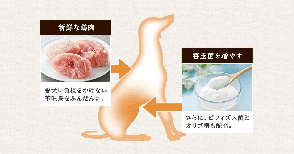 うまかは、新鮮な鶏肉を使った高たんぱくで低脂質なフードのため、それだけでも内臓に負担をかけにくいのですが、さらに腸内環境を整えるために、ビフィズス菌とオリゴ糖を配合しています。