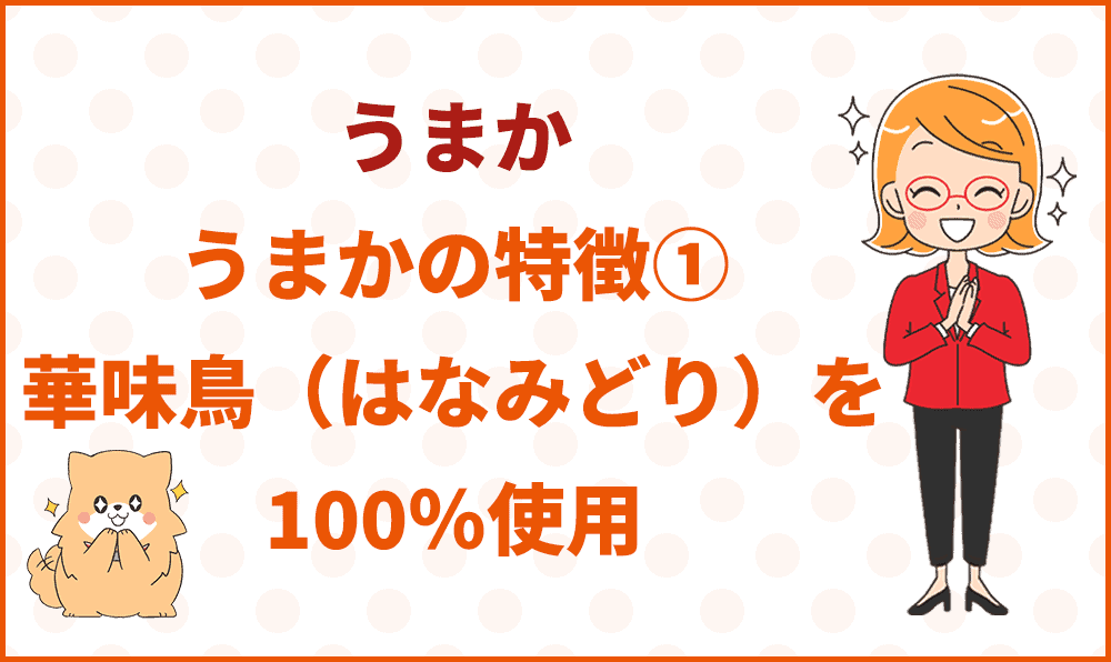 人間が食べられるヒューマングレードの食材を使用したドッグフードは多く出回っていますが、「人間が食べても美味しいと感じられる鶏肉」を使用して作られたフードとなると限られてきてしまいます。うまかで使用している鶏肉は、新鮮で美味しい銘柄鶏「華味鳥」100%なので、うまみが違います。また、食材はすべて国産、栄養バランスも良好、無添加など細部にまでとことんこだわっているので、良質なフードを与えたい飼い主さんのニーズにしっかりと応えています。