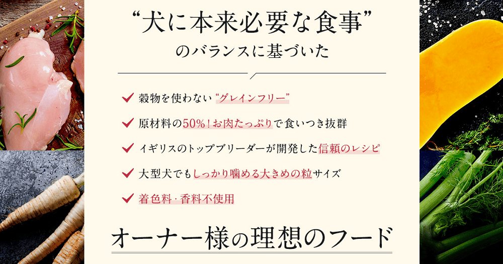 | こだわり | 穀物不使用のグレインフリー、原材料の半分が肉でできている、大型犬が噛みやすい大粒サイズ |