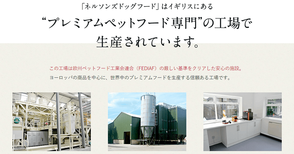 ネルソンズドッグフードが作られている工場は、欧州ペットフード工業会連合(FEDIAF)の厳しい基準をクリアしたプレミアムフード専用の施設です。